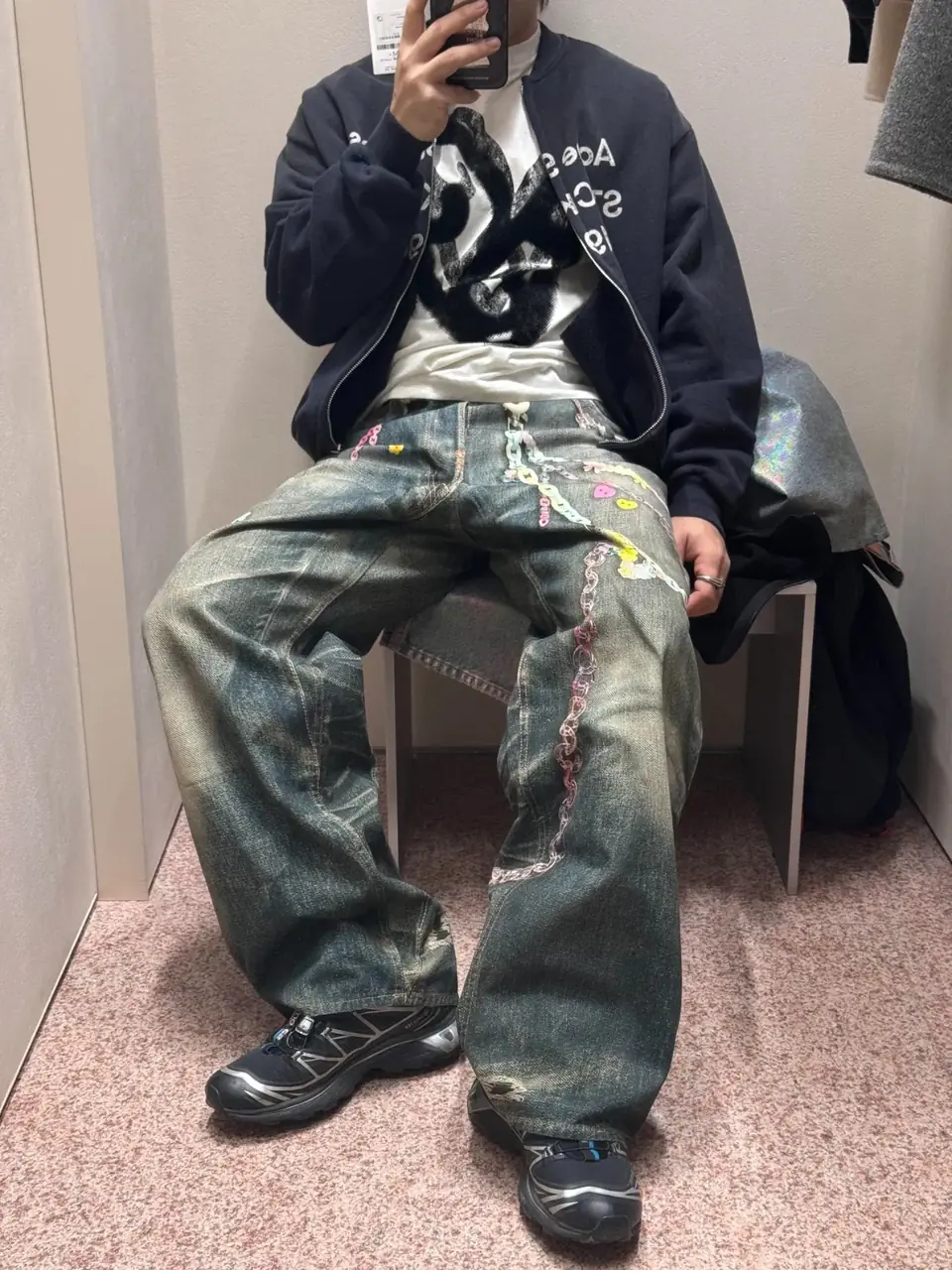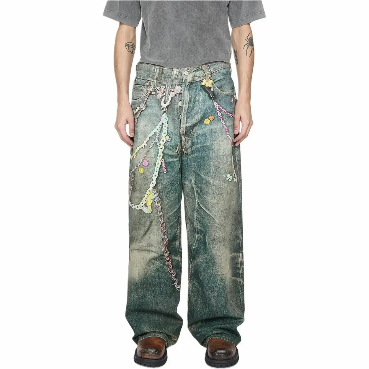並輔以潑墨 褲鏈 鑰匙扣與髒染效果印花