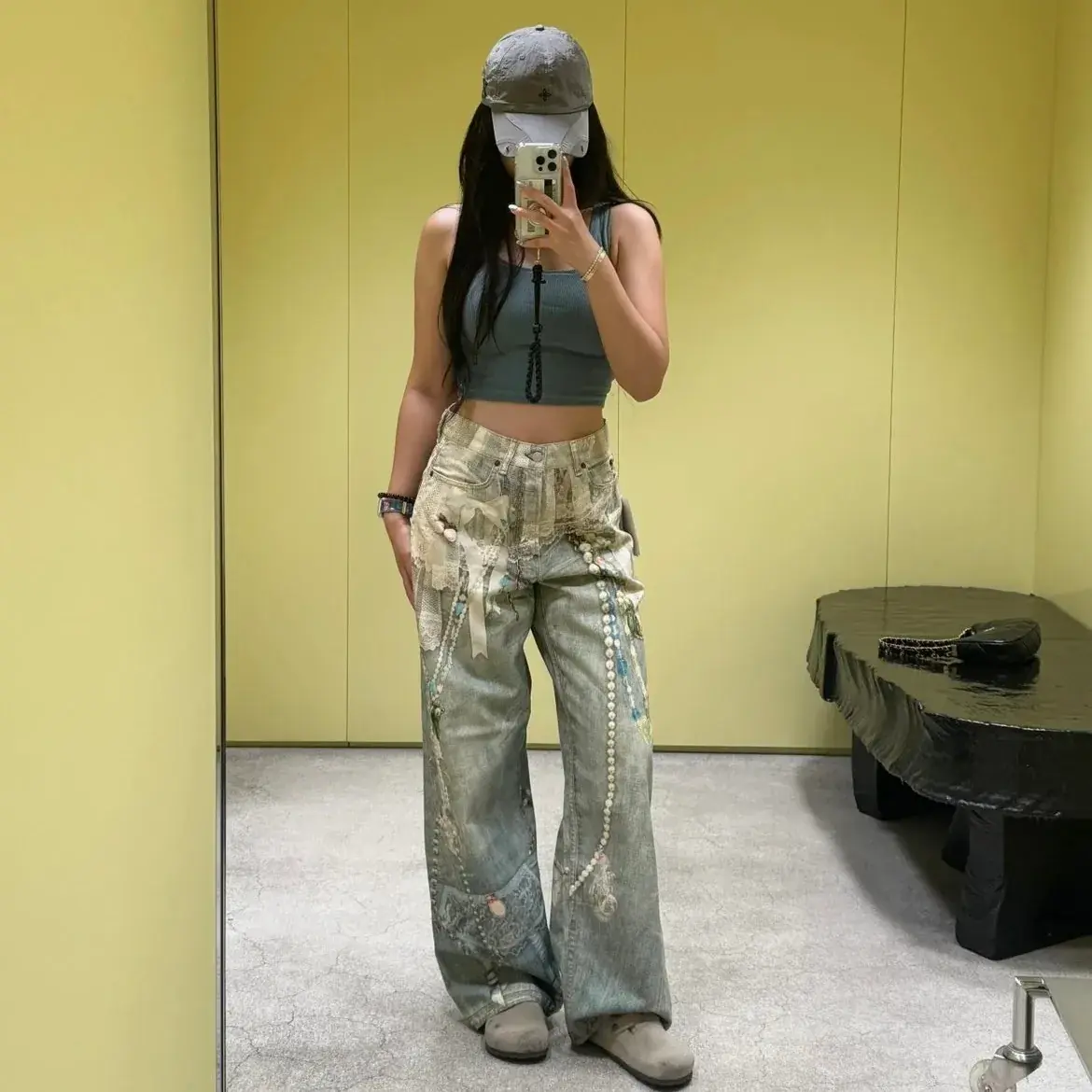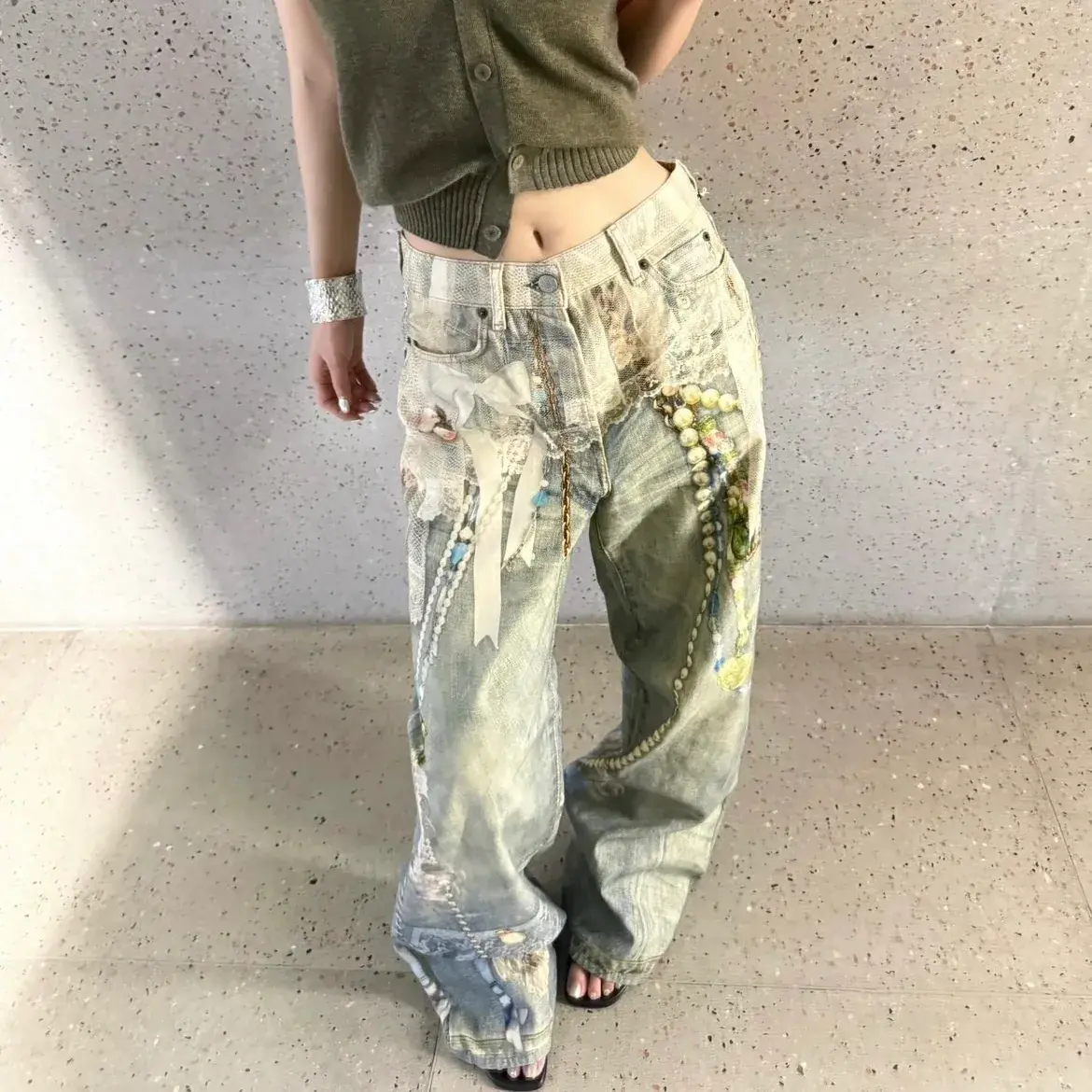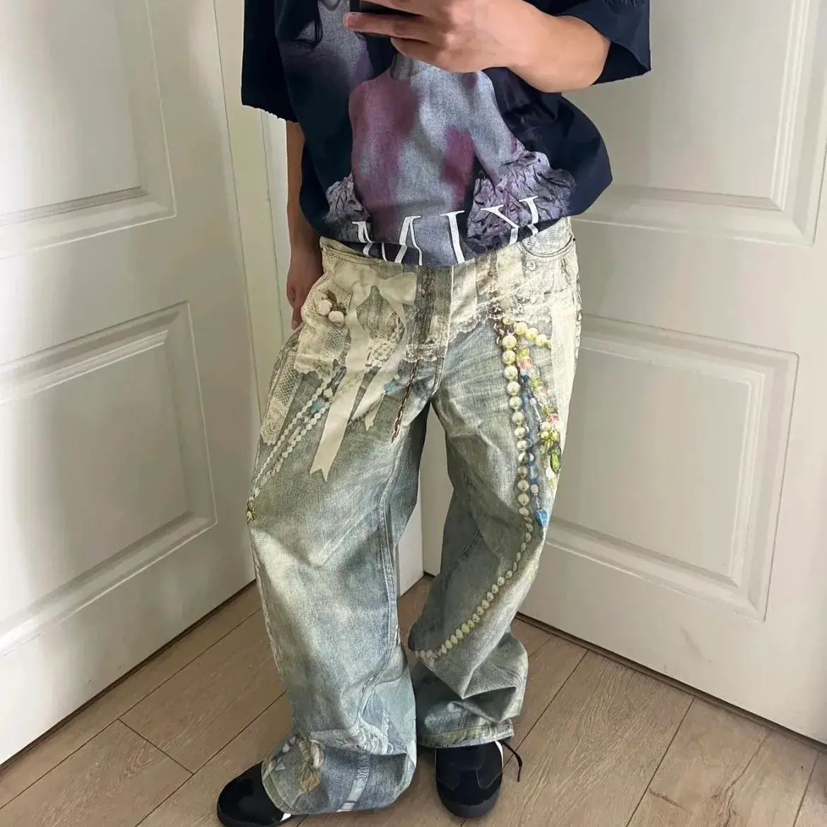 【預售】Acne Studios 25SS 蕾絲珍珠鍊條3D印花 牛仔褲工裝褲 1981M 男女同款